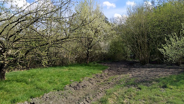Seit fünf Jahren kümmert sich die NABU Ortsgruppe Wardenburg engagiert um eine rund 1,6 Hektar große Streuobstwiese in Achternholt. Die Fläche war vor etwa 30 Jahren von der Biologischen Schutzgemeinschaft Hunte Weser-Ems angelegt worden, jedoch bei der Übernahme durch den NABU in einem stark verwilderten Zustand. Weiden-, Haselnuss-, Brombeer- und Schlehensträucher überwucherten einen Teil der Obstbäume und in einen verflachten Entwässerungsgraben hatten sich Erlen ausgebreitet. Hinzu kommt eine besondere Bodenbeschaffenheit: Unter einer knapp 20 Zentimeter dicken Humusschicht liegt tonhaltiger Untergrund, der bei Regen zu Staunässe führt und in Trockenphasen zu wenig Waser spendet.