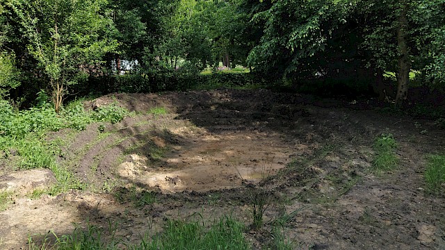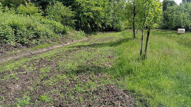Zunächst wurden im März die alten Entwässerungsgräben freigelegt und durch zusätzliche Grabenabschnitte ergänzt, um die Staunässe zu rduzieren. An einer tiefen Stelle wurde eine kleine Senke ausgehoben, die den bei Starkregen anfallenden Niederschlag aus den Entwässerungsgräben aufnehmen kann. Dieses temporäre Kleingewässer kann künftig Amphibien einen Lebensraum bieten und vielleicht auch als Wasserspeicher für trockene Wetterperioden dienen. Auf einer 400 Quadratmeter großen Fläche, wo zuvor Erlen entfernt wurden, konnte im Frühjahr neues regionales Wiesensaatgut eingesät werden.