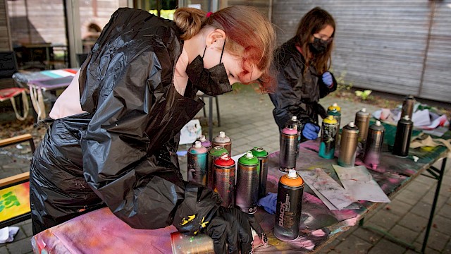 So gestalten beim TalentCAMPus "Street Wear", der in Zusammenarbeit mit der VHS angeboten wird, die Teilnehmenden ihre eigene Street-Wear-Kollektion selber. Gemeinsam mit einem erfahrenen Graffiti-Künstler werden mit viel Spaß und Kreativität persönliche Designs von Hoodies und T-Shirts erarbeitet und im Anschluss präsentiert.